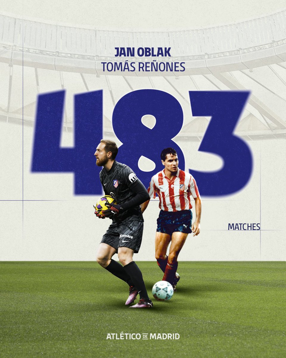 🐐 Oblak equals Tomás Reñones as the third Atleti player with the most official games played in the history of our club! https://t.co/9WWvpZLIL0