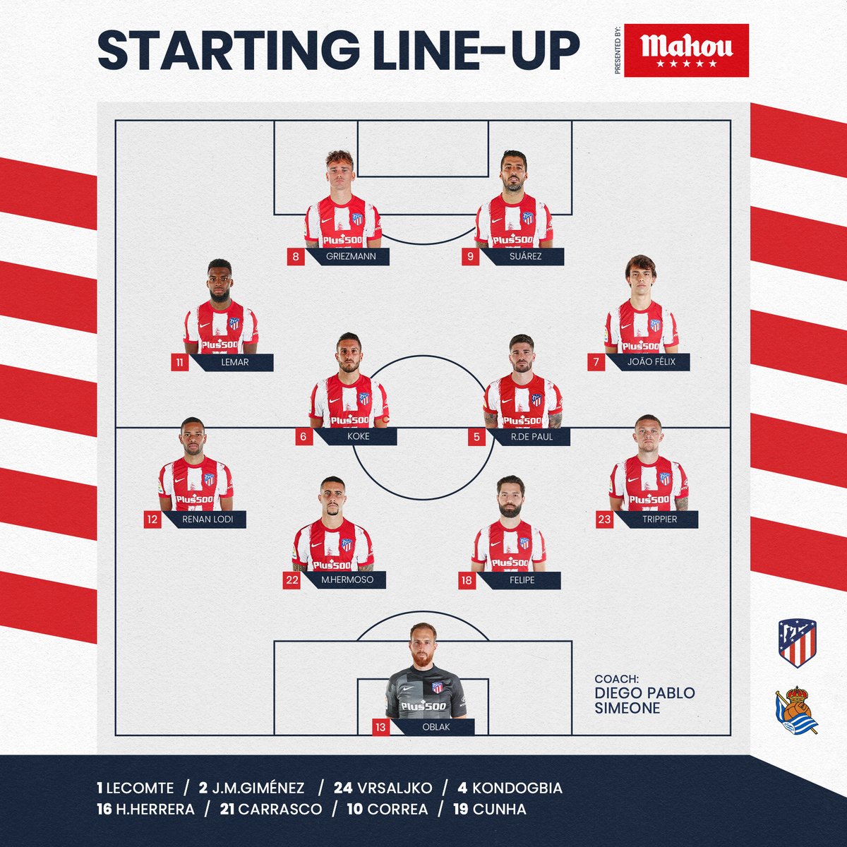 - ⏱ 73' | Atleti 1️⃣-2️⃣ Real Sociedad 🔄 Double change: 🔺 Herrera & Cunha 🔻 Hermoso & Griezmann 🔴⚪ #AúpaAtleti