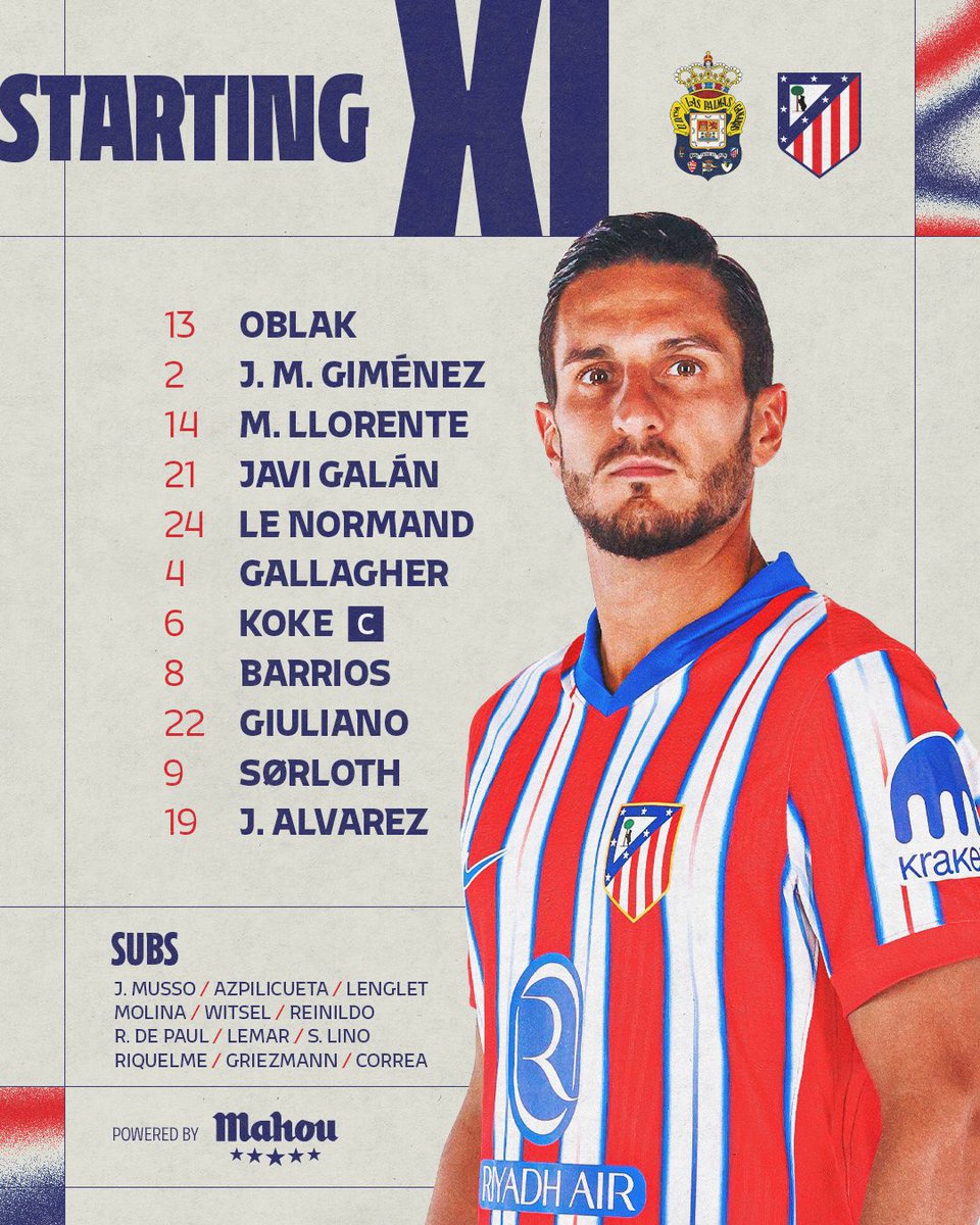 - 59' | Las Palmas 0️⃣-0️⃣ Atleti 🔄 Double change: IN: De Paul & Riquelme OUT: Koke & Gallagher