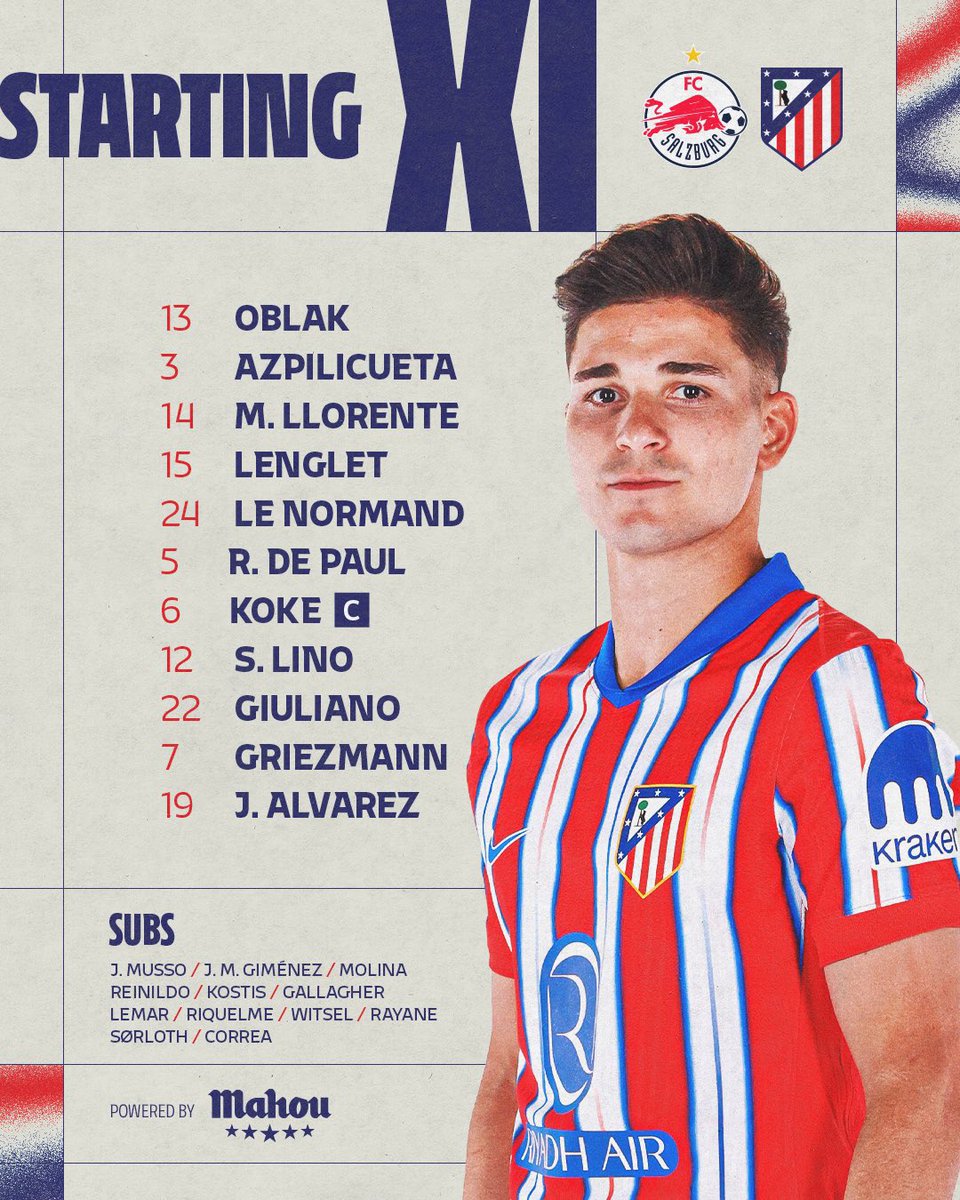 - 66' | Salzburg 0️⃣-4️⃣ Atleti 🔄 Double change: IN: Gallagher & Riquelme OUT: De Paul & Griezmann
